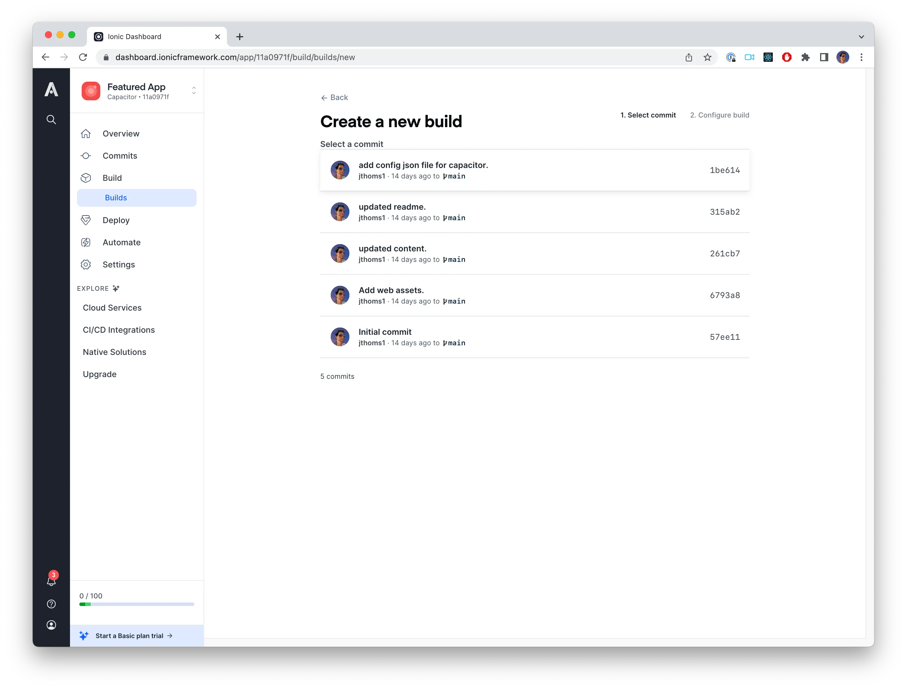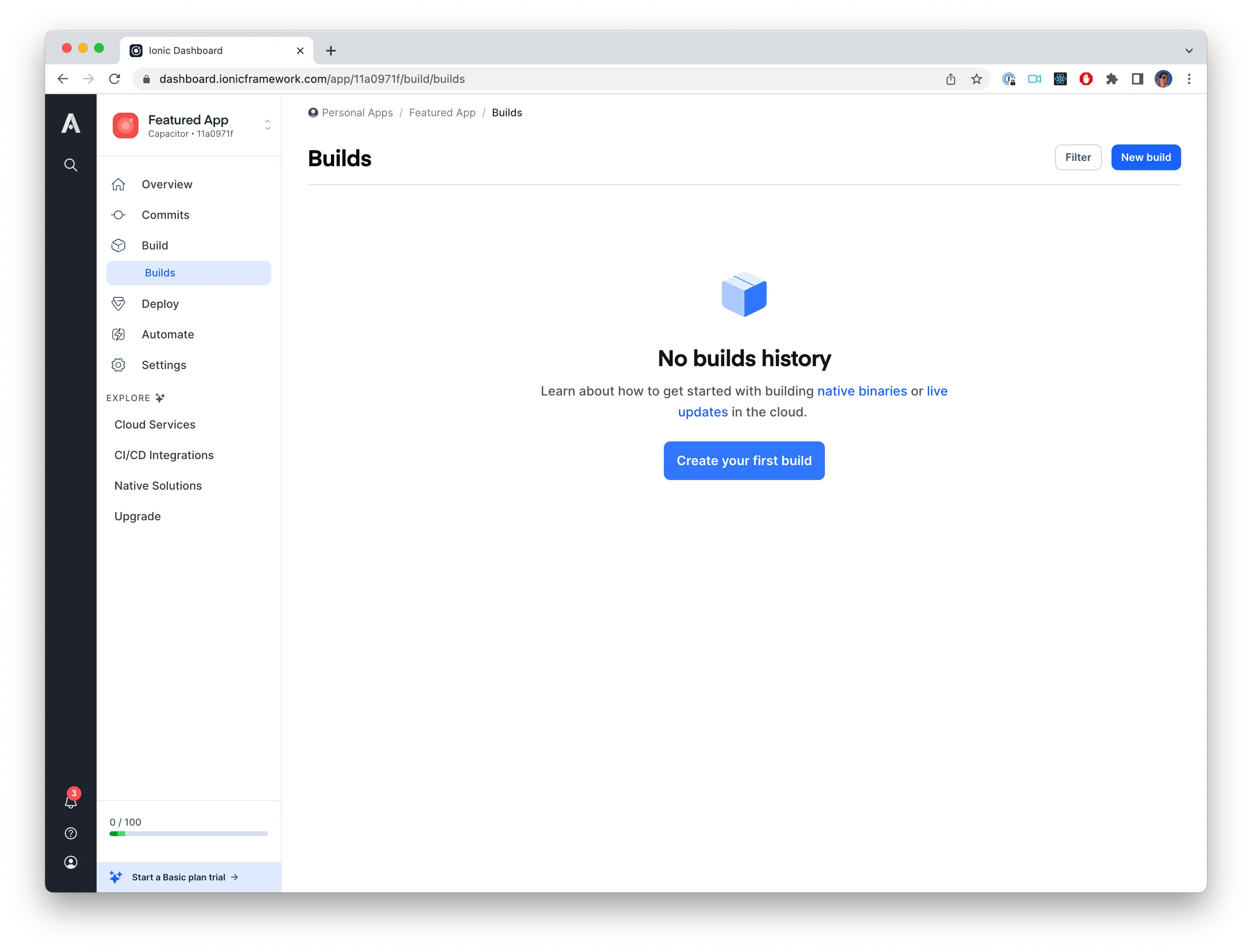 After the app has been created, you can navigate to the Builds page to perform a build. Anytime you want to deploy a new version of the web application, you will need to create a build from this screen or by using the Appflow CLI (which will be covered later).