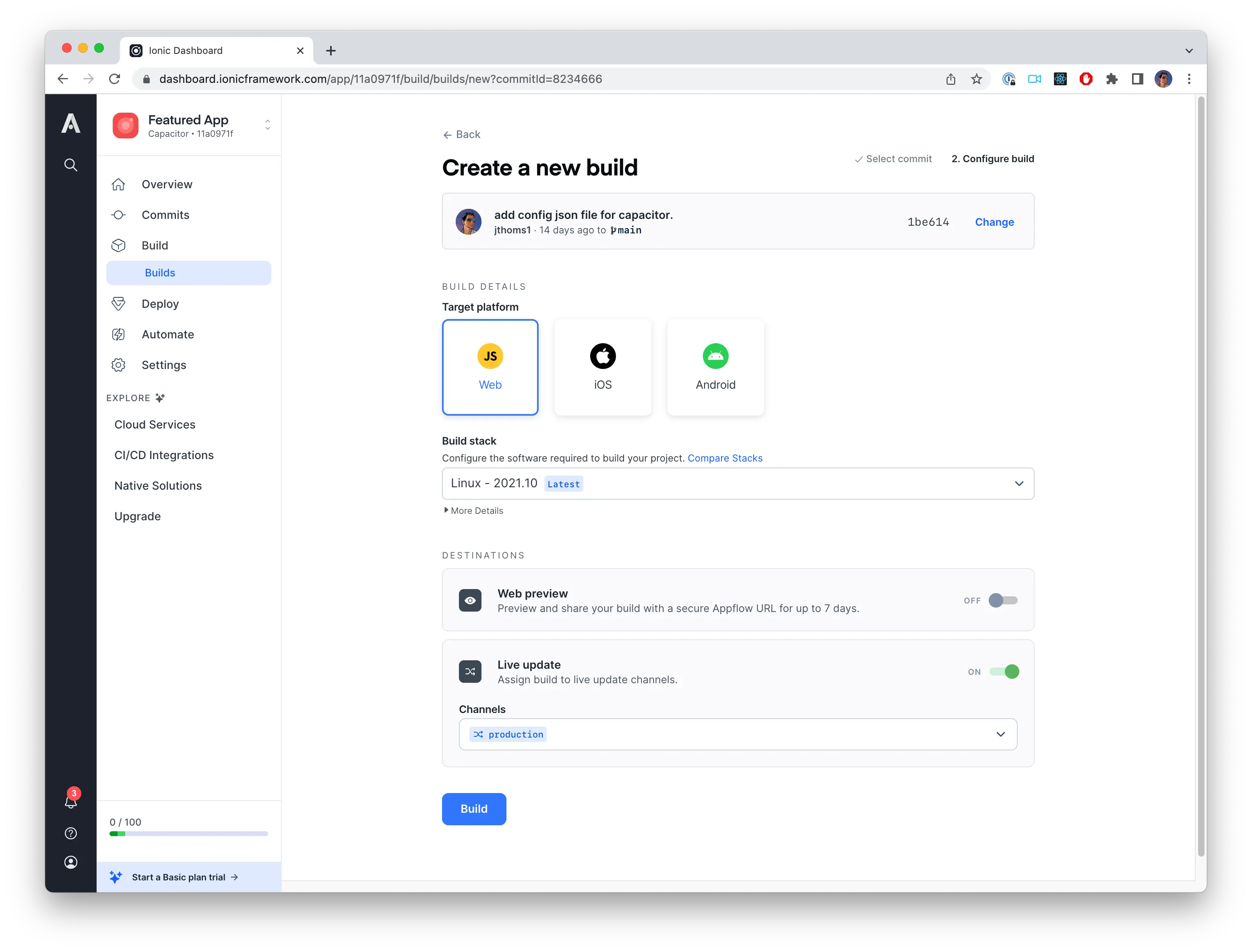 When creating a new build, Appflow will present a few configuration options.