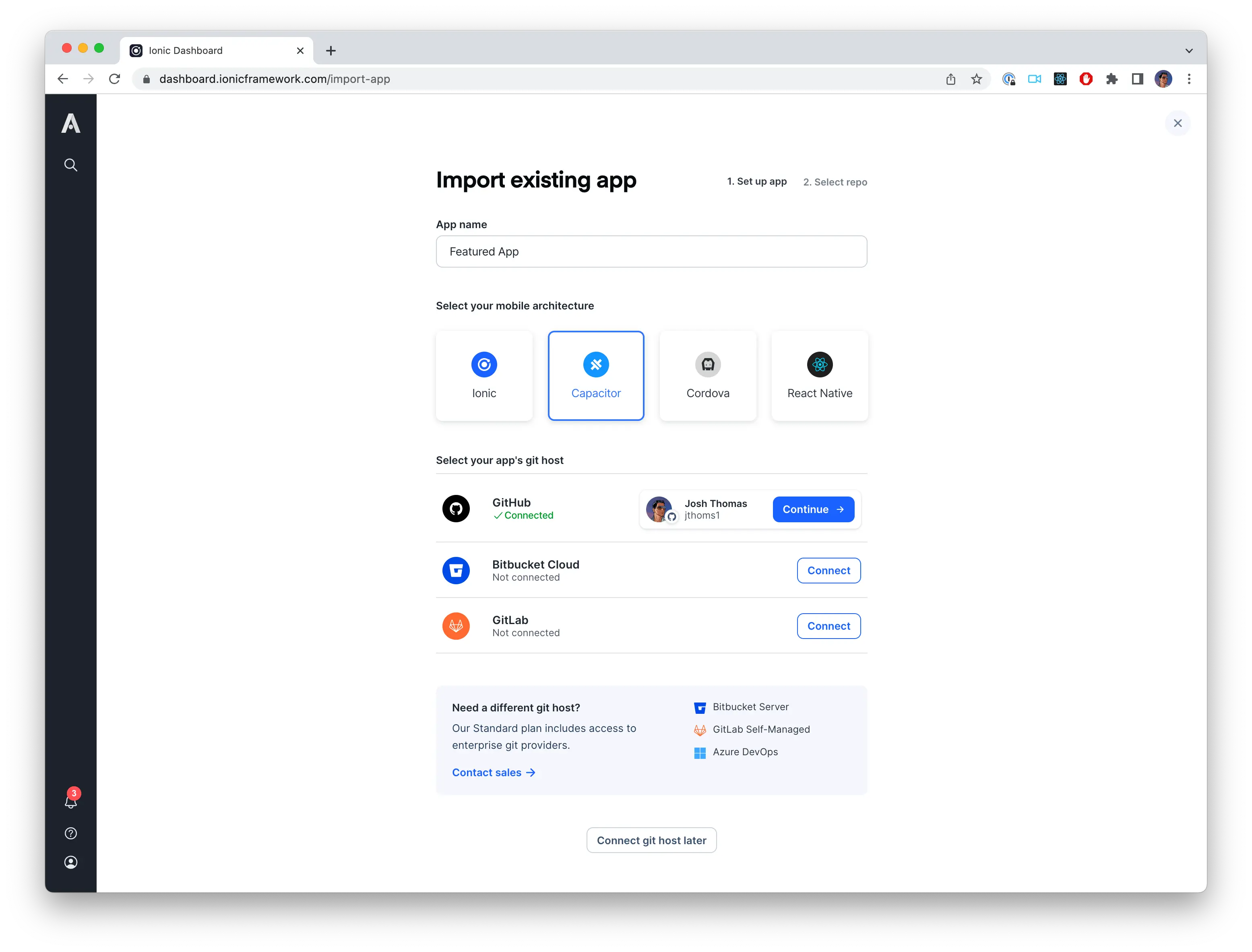 On the Import existing app screen, select Capacitor as the mobile architecture and link the appropriate repository. The app name you provide is only used to identify the app in Appflow, so you may use whichever name makes sense for you.