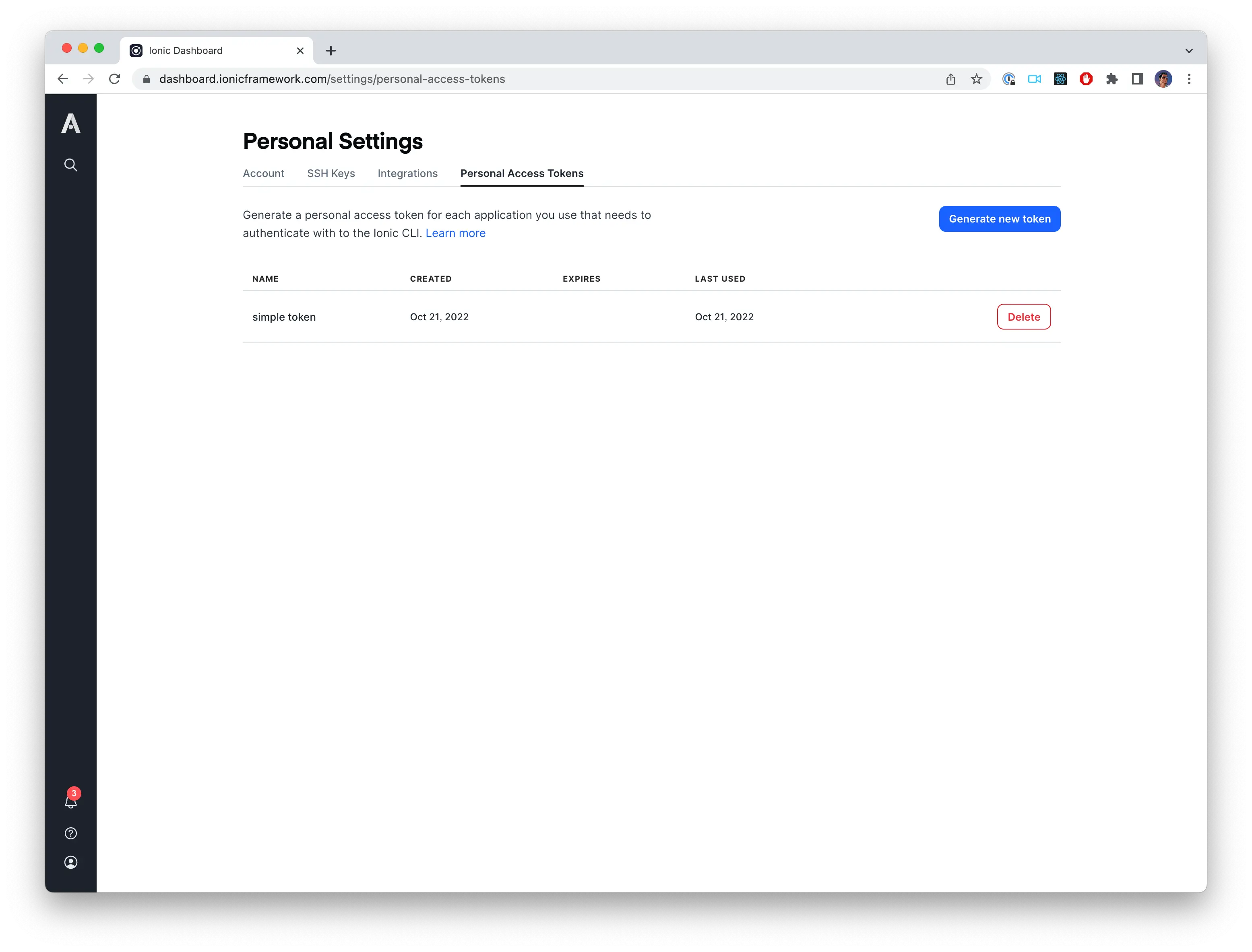 The CLI needs a means to authenticate with Appflow. To do this, we can create a Personal Access Token from the Personal Settings menu. Click the Generate new token button and optionally provide an expiration date for the token.