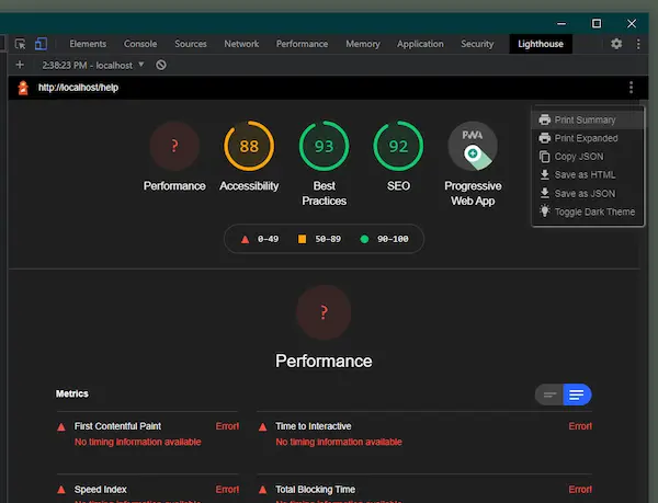 It may be neccessary to share a Lighthouse report with others, such as the web developers who wrote the code being profiled. To export the Lighthouse report data, click the dot menu button in the top right of the report to view export options.